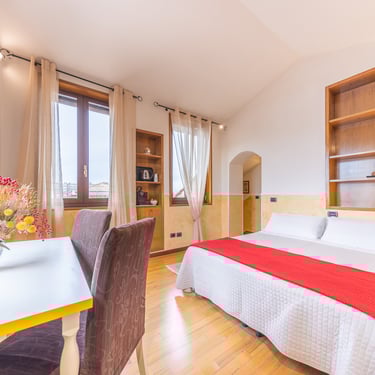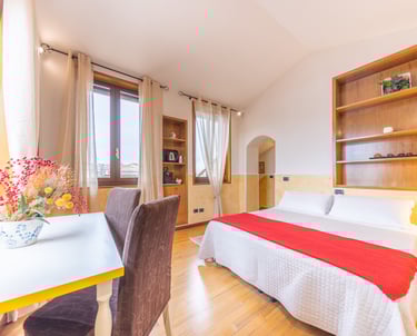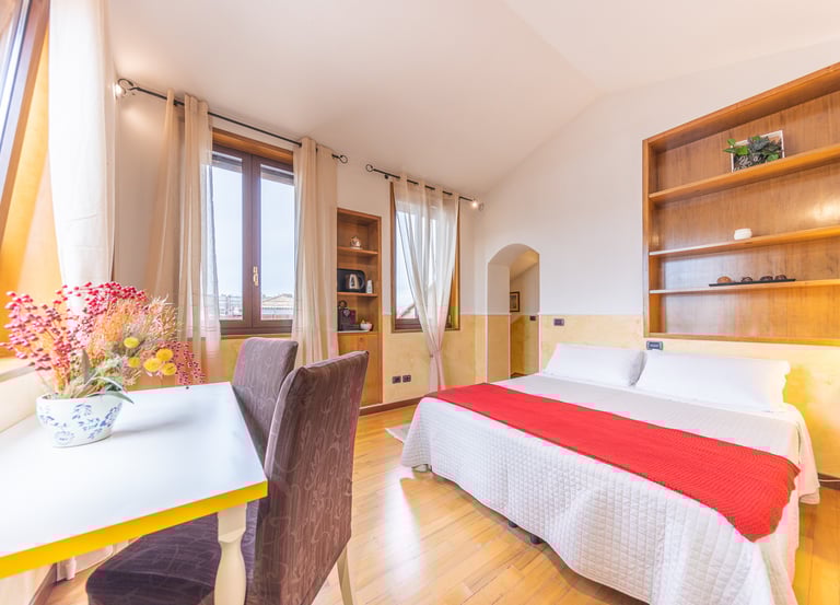 Benvenuti nel nostro Studio Panoramico, un’accogliente camera doppia situata nel cuore di Campo de’ Fiori. Questo studio, ideale per un massimo di due persone, è perfetto per chi cerca un rifugio intimo e luminoso. Nonostante le dimensioni ridotte, è dotato di numerose finestre che inondano lo spazio di luce naturale, offrendo una vista incantevole sui caratteristici tetti di Roma.